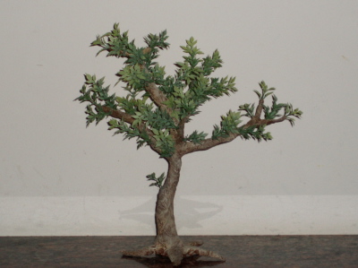 Las ramas como he dicho son de una planta de plástico, para colocarlas he hecho agujeros en el tronco con un punzón y he colocado en ellos ramitas de distintos tamaños pegadas con loctite.