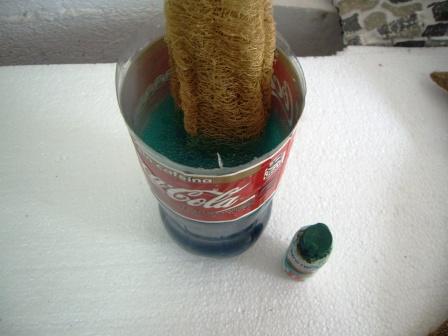 el material es sacado de una planta trepadora que no recuerdo su nombre , se usaba como esponja para lavar platos y demas,un pedazo de palo y tinte verde