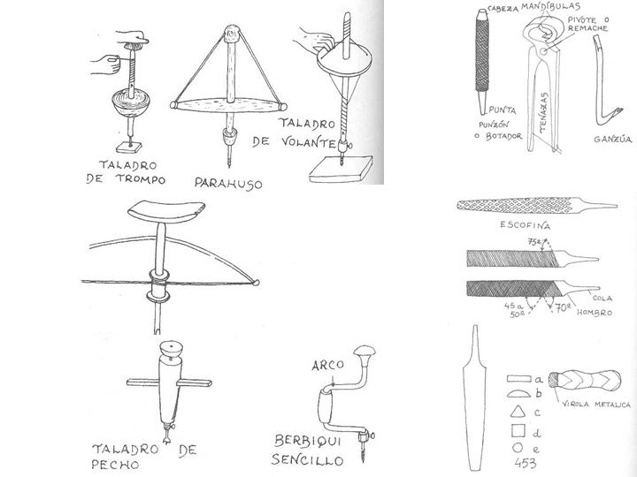 Amplío dibujos de herramientas de carpintería, en concreto son herramientas de madreñero (zuecos).