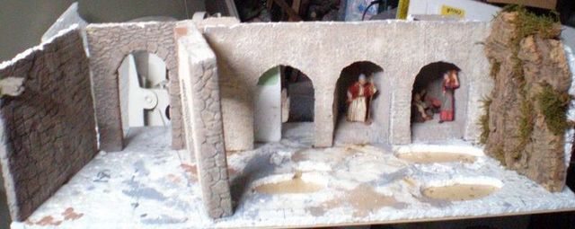 Aquí he tratado de emular, con perdón y su respectivo permiso, la calle final del MAGNÍFICO diorama de la Natividad del pasado año, de M. Zambrana. A mi manera, sí. La idea era reflejar un pastor con un pequeño rebaño, de vuelta al atardecer, que se iluminaran con la luz de una casa colindante a la calle. Al fondo, un murete que cortase la perspectiva, unas palmeras, una pequeña montaña de lejanía producto del raspado de un resto de porex, y una balconada del mismo material.