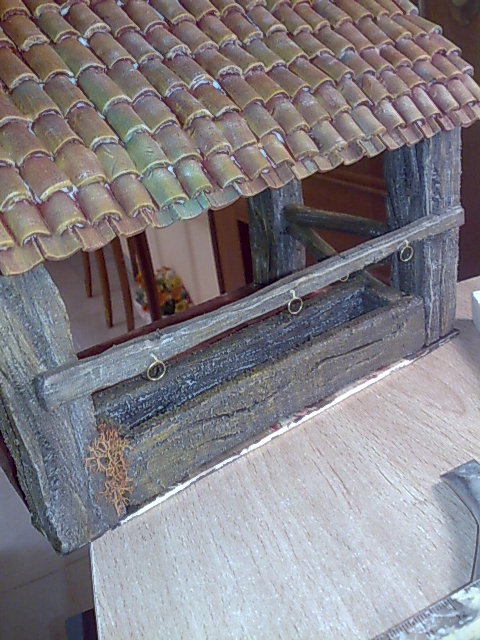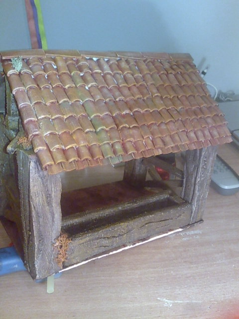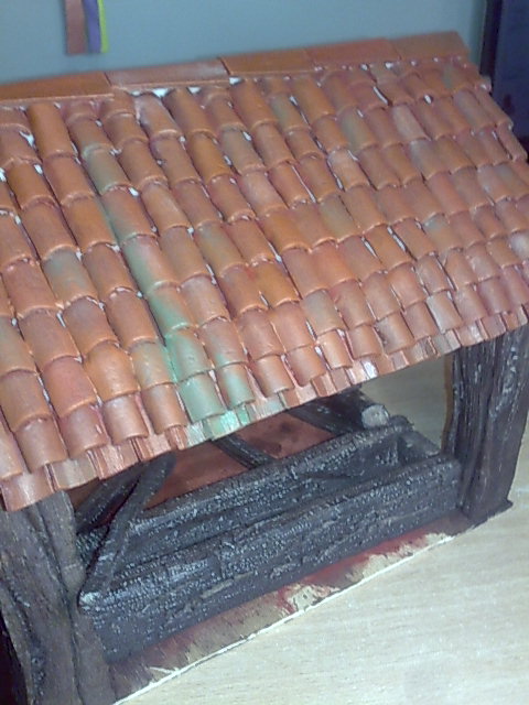 imagen014: en el tema de pintura le he dado un color base de rojo inglés con un poco de negro y ocre, para después dar a varias tejas colores como naranja, amarillos, ocres, rojo ingles,.... o mezclas de éstos para que se vean diferentes. Después pasamos a pincel seco por toda la superficie con un rojo inglés y ocre, después detallamos algunos verdes sin que sea pincel seco, después paso un poco de ocre por todo a pincel seco, a pincel seco pequeños toques de marfil ( esta tecnica me he fijado de jnuñez)