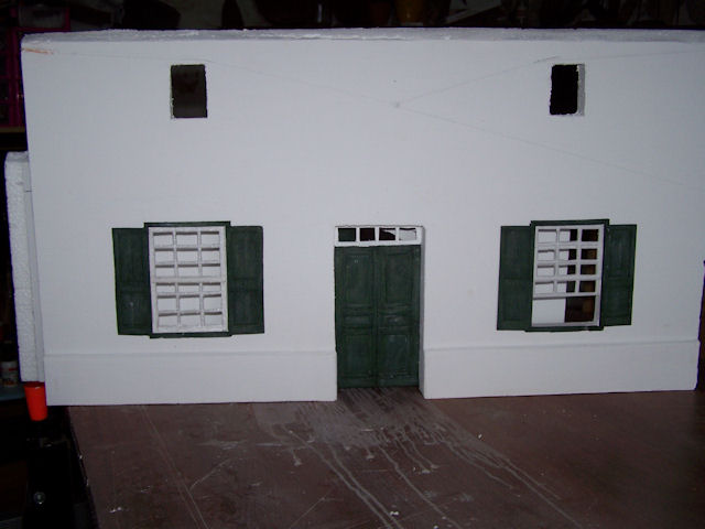 Las paredes las hago con porex de 2 cm. de bolitas porque ira con una capa fina de masilla y pintado de blanco (sin desconches) y las ventanas y puerta principal estan hechas de las bandejas que vienen con los alimentos que compras en los supermercados(de 4mm.)