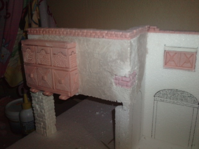 Aqui pongo otra foto con el balcon ya colocado,una ventana puesta, un trozo de la cornisa y tambien he empezado a darle un poco de escayola a la fachada para ir endureciendo la estructura un poco, saludos a todos.