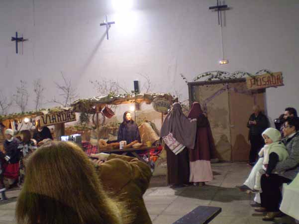 A las 6 de la tarde nos dirigimos a la parroquia de Nuestra Señora de los Angeles donde pudimos ver una preciosa representación de un belén viviente que arrancó los aplausos de todos los presentes por la excelente puesta en escena, trabajo y personas intervinientes entre niños, mayores, dantzaris, coral, músicos, etc... También los belenistas de Miranda agradecieron con unos obsequios a todos los participantes.
