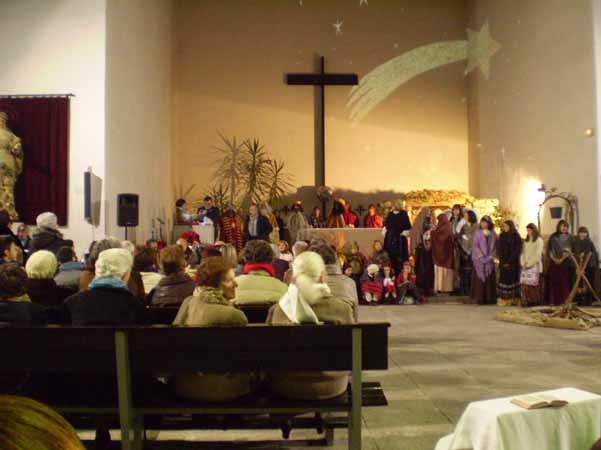 A las 6 de la tarde nos dirigimos a la parroquia de Nuestra Señora de los Angeles donde pudimos ver una preciosa representación de un belén viviente que arrancó los aplausos de todos los presentes por la excelente puesta en escena, trabajo y personas intervinientes entre niños, mayores, dantzaris, coral, músicos, etc... También los belenistas de Miranda agradecieron con unos obsequios a todos los participantes.