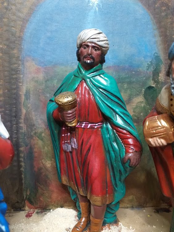 Ayer, día de Reyes, acabé de pintar las figuras que componen la escena de la Epifania y me apresuré a realizar una pequeña composición del escenario para captar unas imagenes con el movil y poder ofrecerlas en el foro. Espero las disfruteis.