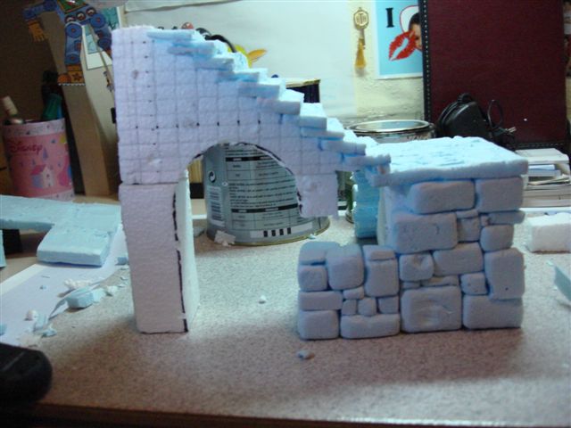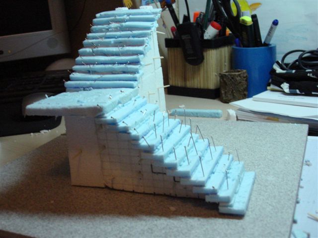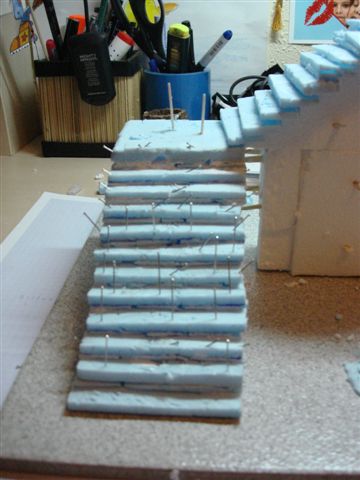 Lo siguiente fue recubrir los huecos entre los escalones, con plaquitas de porex rompiéndolas a trozos pequeños, para intentar de ese modo darle cierto realismo… (ya veremos como queda cuando esté terminada) y fijándolos con alfileres.