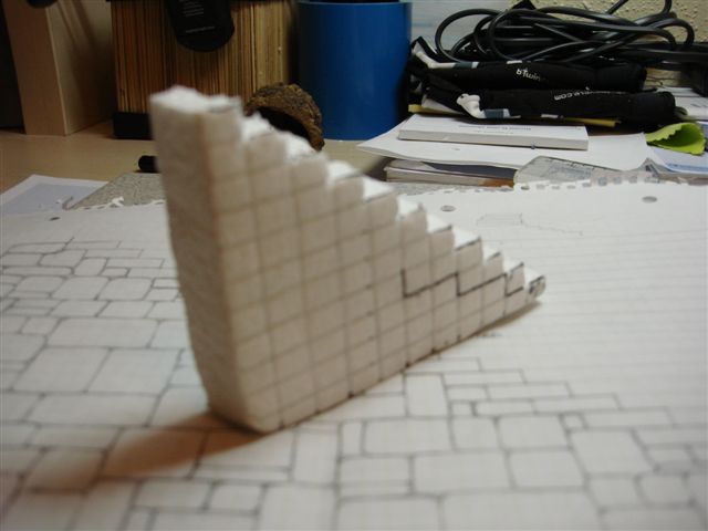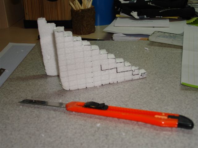 Marqué las medidas y corté el trozo por la mitad. Al principio empecé marcando mal la silueta de la estructura de la escalera. Hay que tener la precaución de que los escalones montan uno sobre otro, con lo cual, una ligera modificación en las marcas, y a seguir. Posteriormente los uní con más trozos de porex para darle a la estructura consistencia y anchura más a la vez.