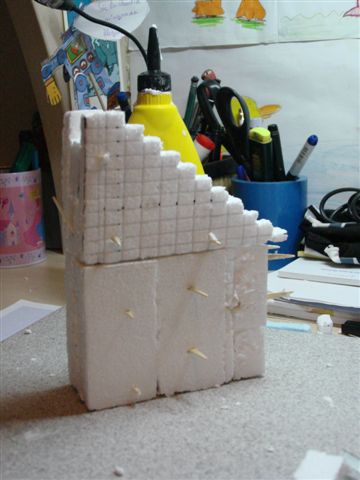 Lo siguiente fue recubrir los huecos entre los escalones, con plaquitas de porex rompiéndolas a trozos pequeños, para intentar de ese modo darle cierto realismo… (ya veremos como queda cuando esté terminada) y fijándolos con alfileres.