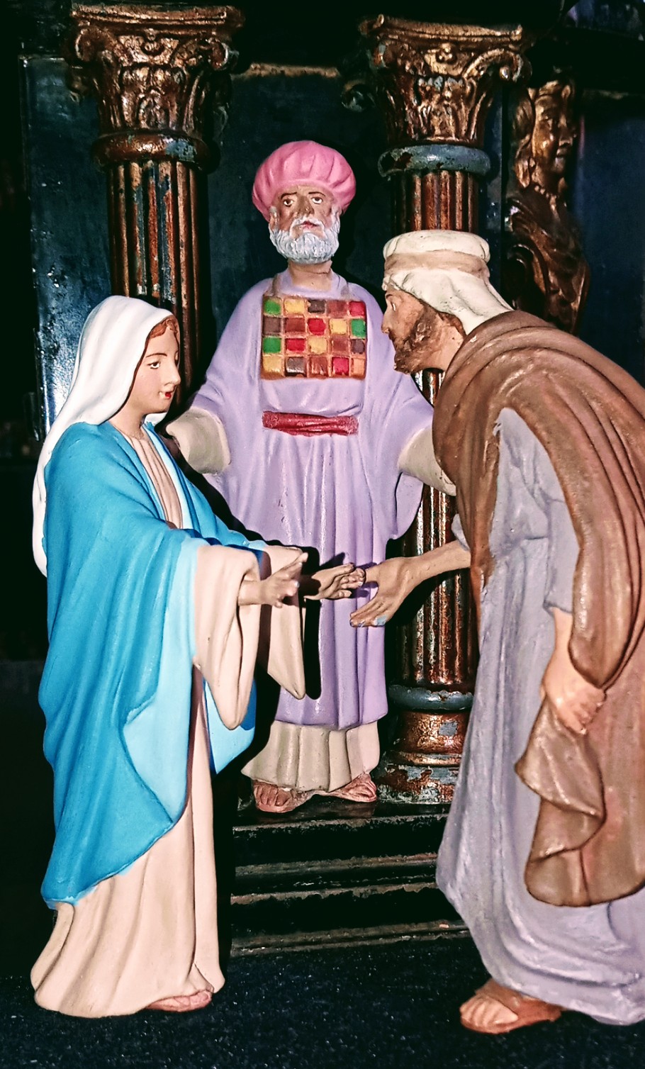 Lo que está claro es que es una escena con un mínimo de tres figuras, María, José con la vara florecida y el Sumo Sacerdote vestido con la túnica del "efod" y la placa pectoral de metal con joyas en el pecho. Castells tiene el grupo, no recuerdo si en 8 o en 11, se reutilizan figuras de otras escenas (el Sumo Sacerdote también está en Jesús frente a los sabios, en 8).