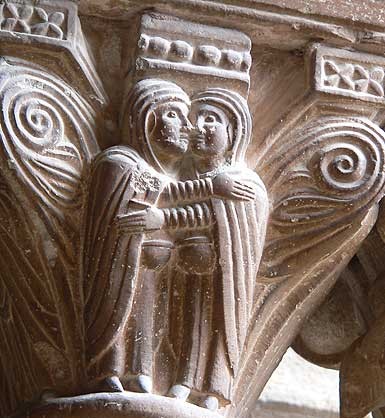 Representación anterior del siglo XII, también dos figuras, en piedra en capitel románico, aún si cabe con más detalle.