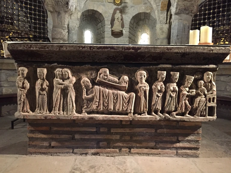 "Iglesia de San Vicente en Roda de Isábena Catedral de Roda de Isábena Huesca, Aragón, España. Siglo IX-siglo XII. En la cripta central se encuentra el sarcófago de San Raimundo de Roda, fechado hacia 1170. Está provisto de relieves que representan en el frente las escenas de la Anunciación, la Visitación, la Natividad y la Adoración de los Magos. En los laterales está representada la huida a Egipto y Raimundo de Roda como obispo rodeado por dos diáconos."