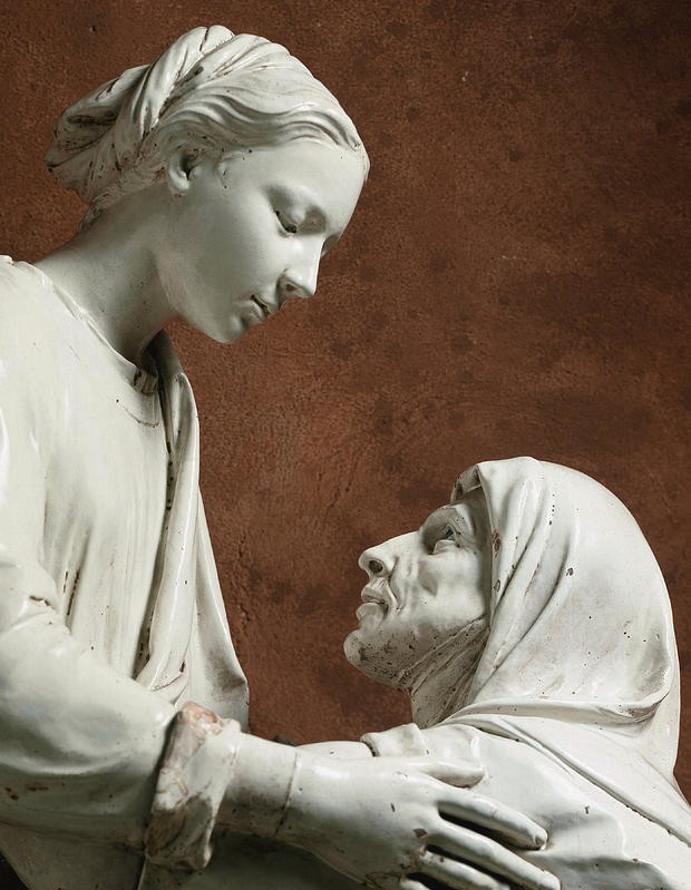 Un ejemplo destacado de esta técnica es La Visitación (alrededor de 1445), un grupo escultórico que se encuentra en la iglesia de San Giovanni Fuorcivitas, en Pistoia. Esta obra representa el encuentro entre la Virgen María y Santa Isabel, capturando con delicadeza y realismo el momento de su mutua bendición. La composición y los detalles muestran la maestría de della Robbia en combinar expresividad emocional y refinamiento técnico.