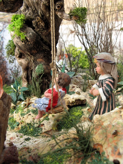 La verdad es que son figuras de los chinos. Como es complicado encontrar niños para el belen, compre estas figuritas. La niña mayor era una hada, el mediano un monaguillo y los pequeños dos angelitos dorados encima de una bola. Total que tuve que tunearlos a los cuatro. Vestirlos y pintarlos de nuevo, incluso al del columpio lo tuve que romper en trocitos y componerlo como pude. Pero tienes toda la razón hay que darles un poco de "Rayos uva", para ponerlos morenos.