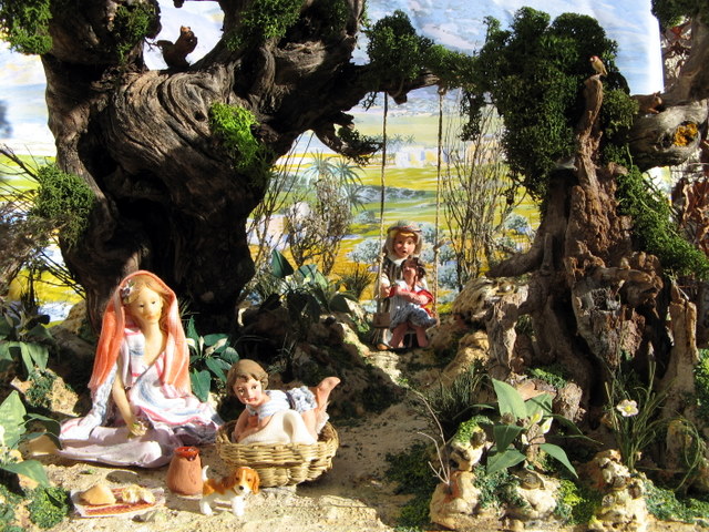 La niña mayor era una hada del bosque a la que mutile las hadas y la vesti con ropajes de la epoca. El niño mediano era un monaguillo tocando los palillos y lo volvi a pintar y le puse un turbante. Los niños pequeños esran dos angelitos dorados, a los que también le mutile las alas, los pinte y vesti como ves en la fotografía.