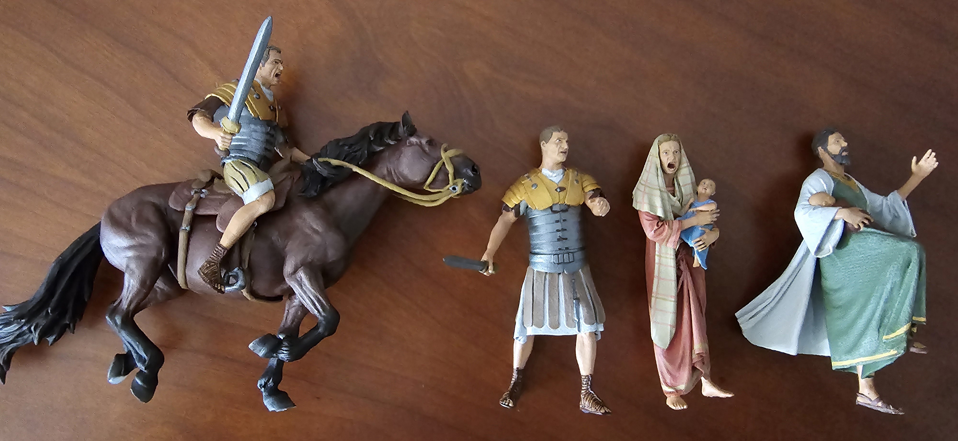 Se vende escena en 3D de gran realismo. Sólo un único uso Belén Monumental. Está elaborado en resina polímero y pintada a mano. Se compone de Romano a caballo galopando, hebreo corriendo con bebé, mujer con bebé y romano a pie.