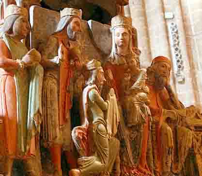 Es curioso ver que aunque se realizo en el siglo XIII, la virgen y todos los que le rodean llevan ropajes romanos
