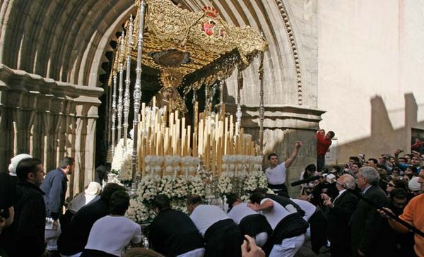 ¡Ah! se me olvidó deciros que el "paso" no debe tocar el suelo en ningun momento, se saca sosteniendolo a pulso, aparte de los costaleros que veis por fuera, debajo van 30 más de rodillas.