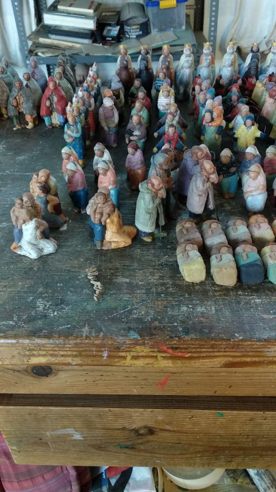 El taller olotino está en pelno rendimiento... creo que Laura y Ester están ya modelando las novedades para esta Navidad que no está tan lejos... y mientras el barro fresco aroma cada rincón del taller, dormidas en las estanterías quedan algunas figuras, no muchas, que esperan empezar a ser para lo que fueron concebidas...