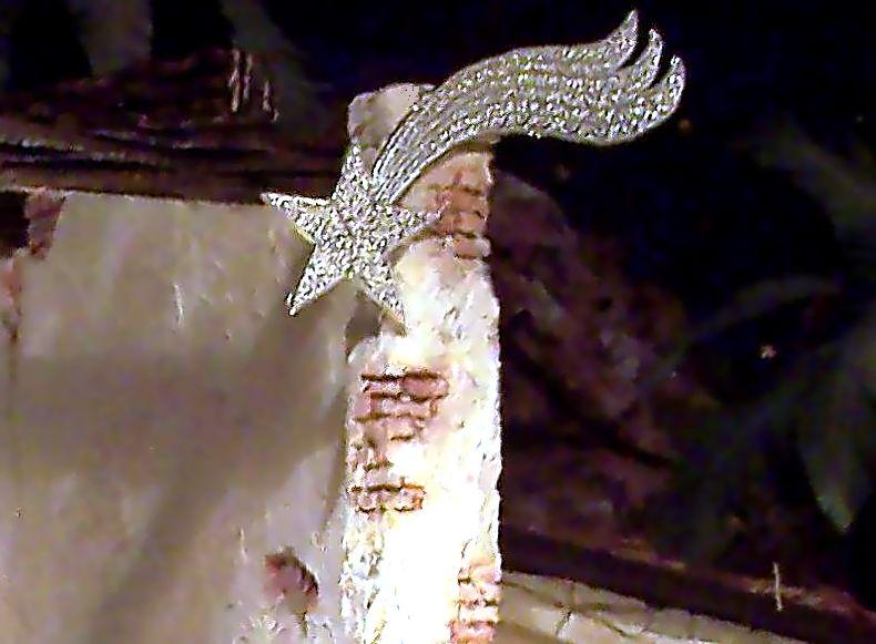 Mira esta foto, el ángel cuelga de un hilo de sedal y la estrella de su mano. No es barata sino swarosski o como se diga.