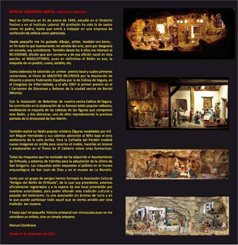 Hola forer@s,os comunico que a peticion del ayuntamiento de Beniel-provincia de Murcia- expusiera todos mis trabajos realizados ultimamente-en total 12 piezas- y me ha encantado ponerlas a la vista de todos los que se dignen visitarlas, os pongo el folleto que me han dedicado para tal fin, lugar y horarios, estan todos menos el triptico que me ha pedido la asociacion de alicante,el ya conocido pidiendo posada, de la contraportada del libro belenes y pesebres de España, os pongo tambien la foto, y si alguien tiene interes en ver mi modesta contribucion al belenismo ya sabe.