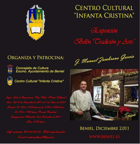 Hola forer@s,os comunico que a peticion del ayuntamiento de Beniel-provincia de Murcia- expusiera todos mis trabajos realizados ultimamente-en total 12 piezas- y me ha encantado ponerlas a la vista de todos los que se dignen visitarlas, os pongo el folleto que me han dedicado para tal fin, lugar y horarios, estan todos menos el triptico que me ha pedido la asociacion de alicante,el ya conocido pidiendo posada, de la contraportada del libro belenes y pesebres de España, os pongo tambien la foto, y si alguien tiene interes en ver mi modesta contribucion al belenismo ya sabe.
