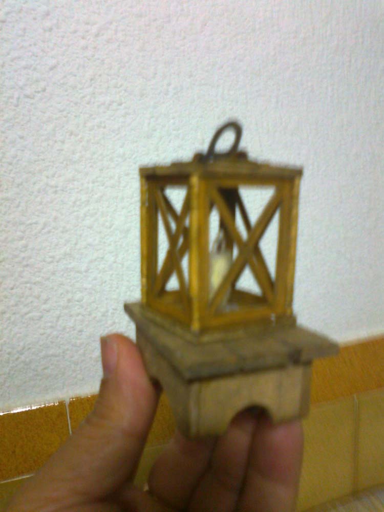 Aqui os subo un trabajo realizado con cartón, es un farol de madera sobre un taburete, un elemento de decoración para un pesebre, espero que os guste.