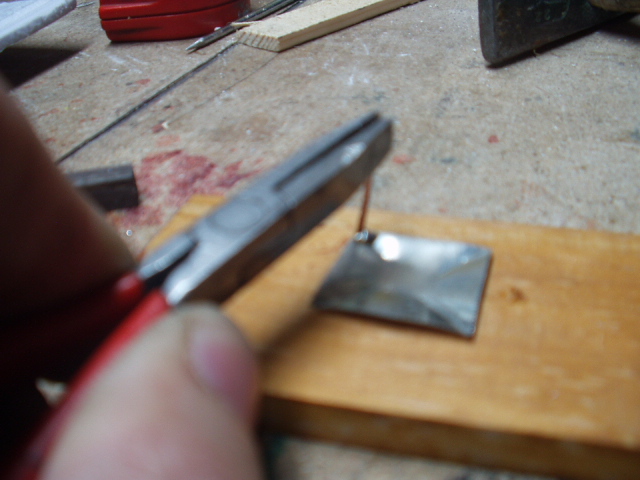 16) Cortamos de alambre de cobre rígido de 2 milímetros de grosor un trozo de 50 milímetros de largo y con los alicates de punta fina le damos la forma cuadrada que se ve en la imagen .