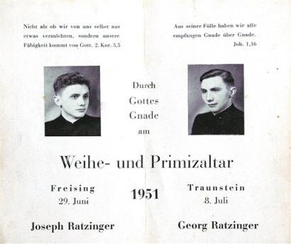 El Santo Padre fue ordenado sacerdote el 29 de junio de 1951 junto a su hermano, Mons. Georg Ratzinger, en la Catedral de Freising (Alemania).