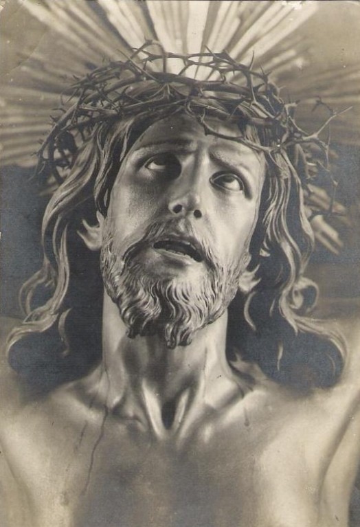 Se que esta hecha en pasta de madera,tiene sus ojos de cristal y mide 35 cmts.Es una imagen que su sentimiento lo refleja en un realismo casi real.