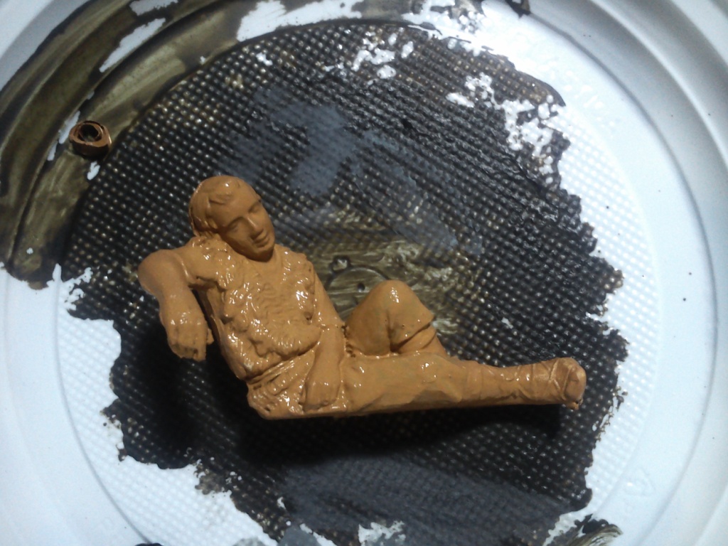 La primera de las fotos, es la figura con su pintura original, la segunda es la figura pintada con una capa de color "terra cotta" simplemente para tapar los colores anteriores y poder partir de 0, y las últimas son el resultado del repintado.