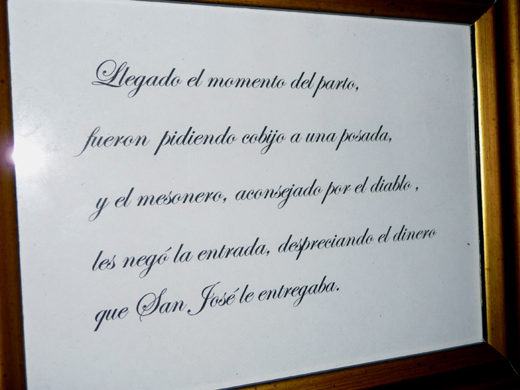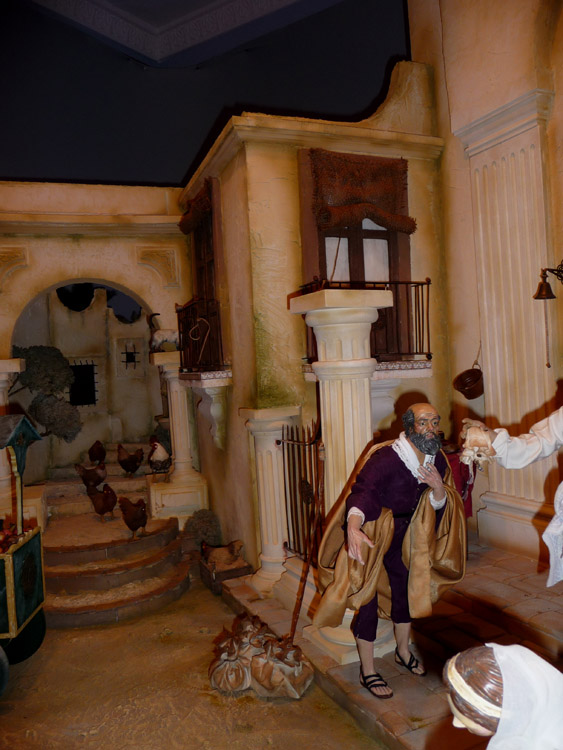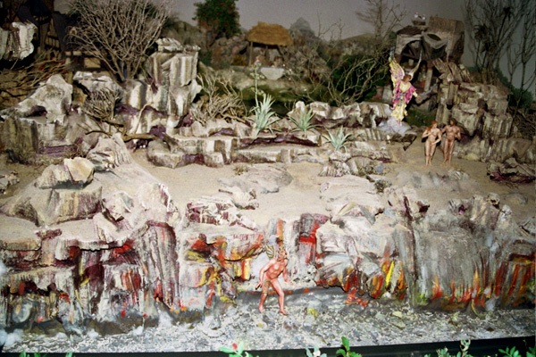 " Belén simbólico. Primer plano, Adán y Eva expulsados del Paraíso. Segundo plano: alrededor de un lago con pequeñas cascadas, La Anunciación a María, El Nacimiento y La Adoración de Los Magos".