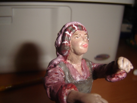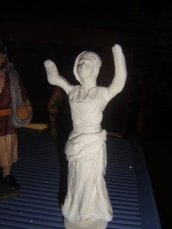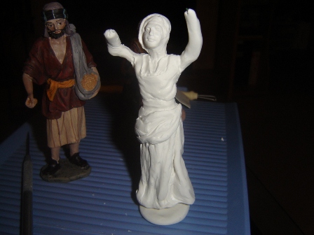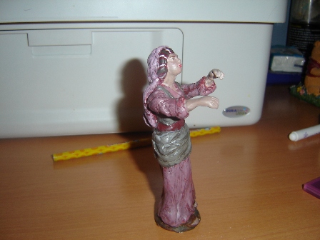 En cuanto a las medidas es de 11 o 12 cm. ya que la he hecho adaptándola al tamaño de las figuras del Belén de Ediciones El Prado que es el que tengo y los colores que le voy a dar serán también semejantes, para que no desentone. Hoy he empezado a pintar la cara y para conseguir el color que tienen esas figuras he tenido que echarle imaginación porque los colores que ponía en algunos paso a paso no me resultaban (quedaba un tono demasiado rosa para el color de piel de esas figuras). A ver que os parece la mezcla: he usado el carne tostada, marrón (brown umber), un poquito de rojo y el blanco (todos de la Americana) mezclándolos hasta conseguir un tono parecido al de las del Prado que, al final, he tenido que volver a retocar porque al secar oscureció. ¡¡Ah!!, ahora que hablo del Belén del Prado, a ver si alguien me puede resolver una duda. Hoy he sacado las figuras del Belén para cambiarlas de la caja en que venían a un baul de estos de plástico con ruedas. Bueno, a lo que iba, resulta que cuando me vinieron lo único que hice fué comprobar si venía alguna rota o si faltaba alguna pieza, pero no se me ocurrió poner juntas las figuras de la Virgen María y de San José y hoy me he dado cuenta de que no guardan proporción, es decir, la Virgen María es enorme en proporción a San José; si se pusiera de pié le sacaría una cabeza y en una pelea seguro que le gana, Je, Je ... ;) ;) ¿Es así en todas las ediciones o es que se han equivocado en mi envio?.