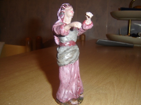 En cuanto a las medidas es de 11 o 12 cm. ya que la he hecho adaptándola al tamaño de las figuras del Belén de Ediciones El Prado que es el que tengo y los colores que le voy a dar serán también semejantes, para que no desentone. Hoy he empezado a pintar la cara y para conseguir el color que tienen esas figuras he tenido que echarle imaginación porque los colores que ponía en algunos paso a paso no me resultaban (quedaba un tono demasiado rosa para el color de piel de esas figuras). A ver que os parece la mezcla: he usado el carne tostada, marrón (brown umber), un poquito de rojo y el blanco (todos de la Americana) mezclándolos hasta conseguir un tono parecido al de las del Prado que, al final, he tenido que volver a retocar porque al secar oscureció. ¡¡Ah!!, ahora que hablo del Belén del Prado, a ver si alguien me puede resolver una duda. Hoy he sacado las figuras del Belén para cambiarlas de la caja en que venían a un baul de estos de plástico con ruedas. Bueno, a lo que iba, resulta que cuando me vinieron lo único que hice fué comprobar si venía alguna rota o si faltaba alguna pieza, pero no se me ocurrió poner juntas las figuras de la Virgen María y de San José y hoy me he dado cuenta de que no guardan proporción, es decir, la Virgen María es enorme en proporción a San José; si se pusiera de pié le sacaría una cabeza y en una pelea seguro que le gana, Je, Je ... ;) ;) ¿Es así en todas las ediciones o es que se han equivocado en mi envio?.