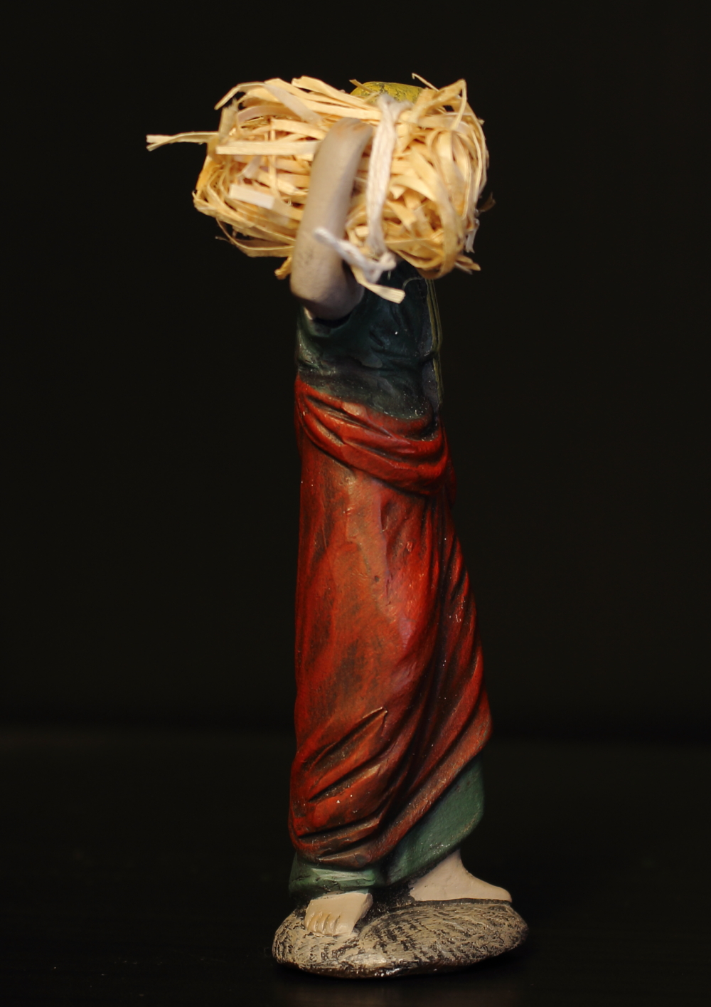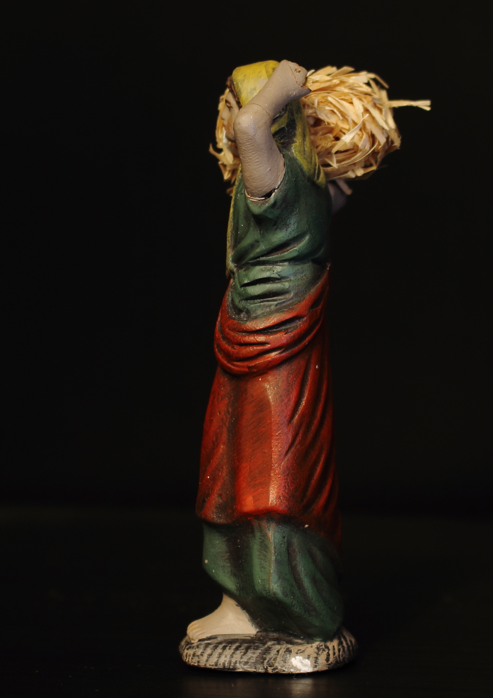 Pastora de camino con fardo de paja (tiene sendas roturas en el brazo y la mano izquierdos, están pegadas, se nota un poco, ver fotos), 11cm. - 18 €