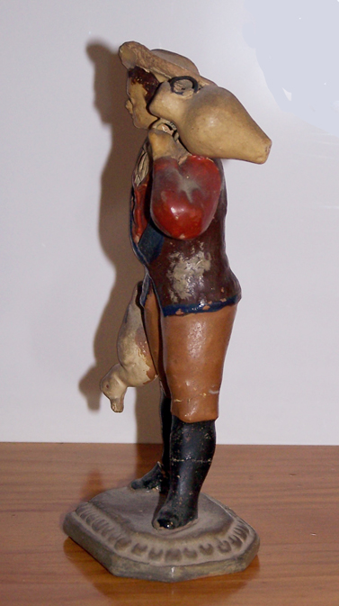En cuanto a las otras dos figuras, ay, es muy difícil adjudicar autorías si no son de los escultores más "clásicos". El "gachero" no es catalán a mi entender, lo que lleva no es una "barretina" sino un bicornio con la vuelta de color rojo. Como Antoni, coincido en pensar que son de escuela murciana... y no la tengo demasiado ubicada.