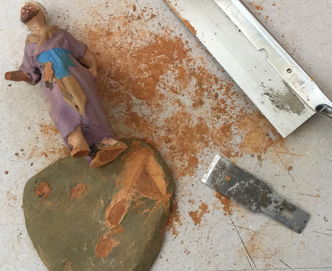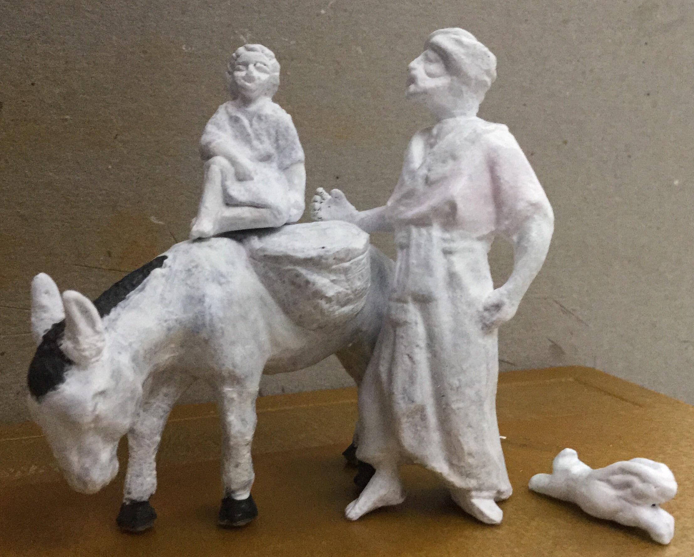 Lo siguiente fue quitar rebabas de las vestimentas y pulir caras y extremidades (pelo de cabezas y barba, manos, brazos y pies). También a la mula, sobre todo quitarle material al cesto que estaba desproporcionado con respecto al original y terminarlo más fino, pegarle las patas y hacerles las orejas. Al pastor la mano y que fuera versátil a las dos variantes con el grupo e individual, las partes nuevas (orejas, mano y conejo) con pasta de arcilla de secado al aire: