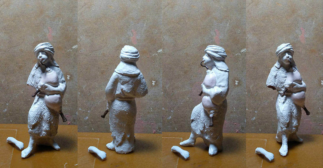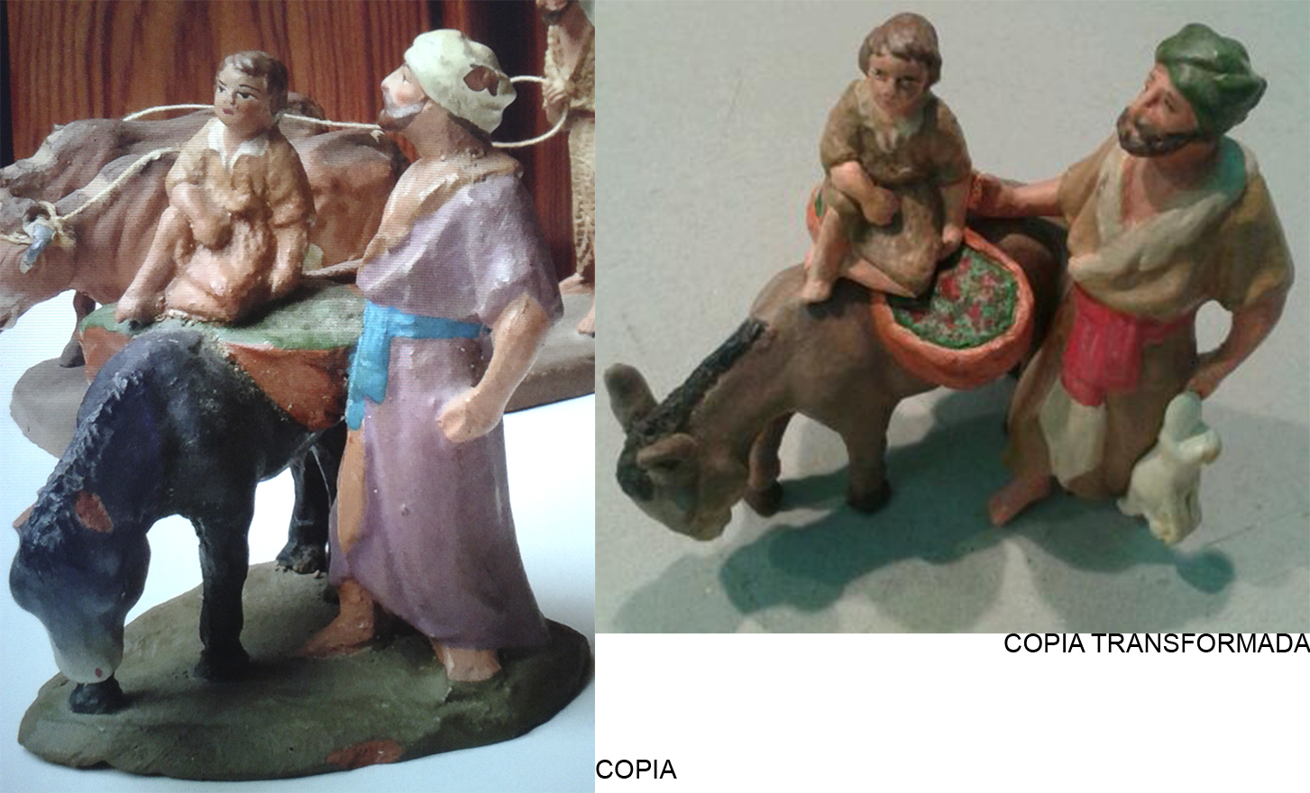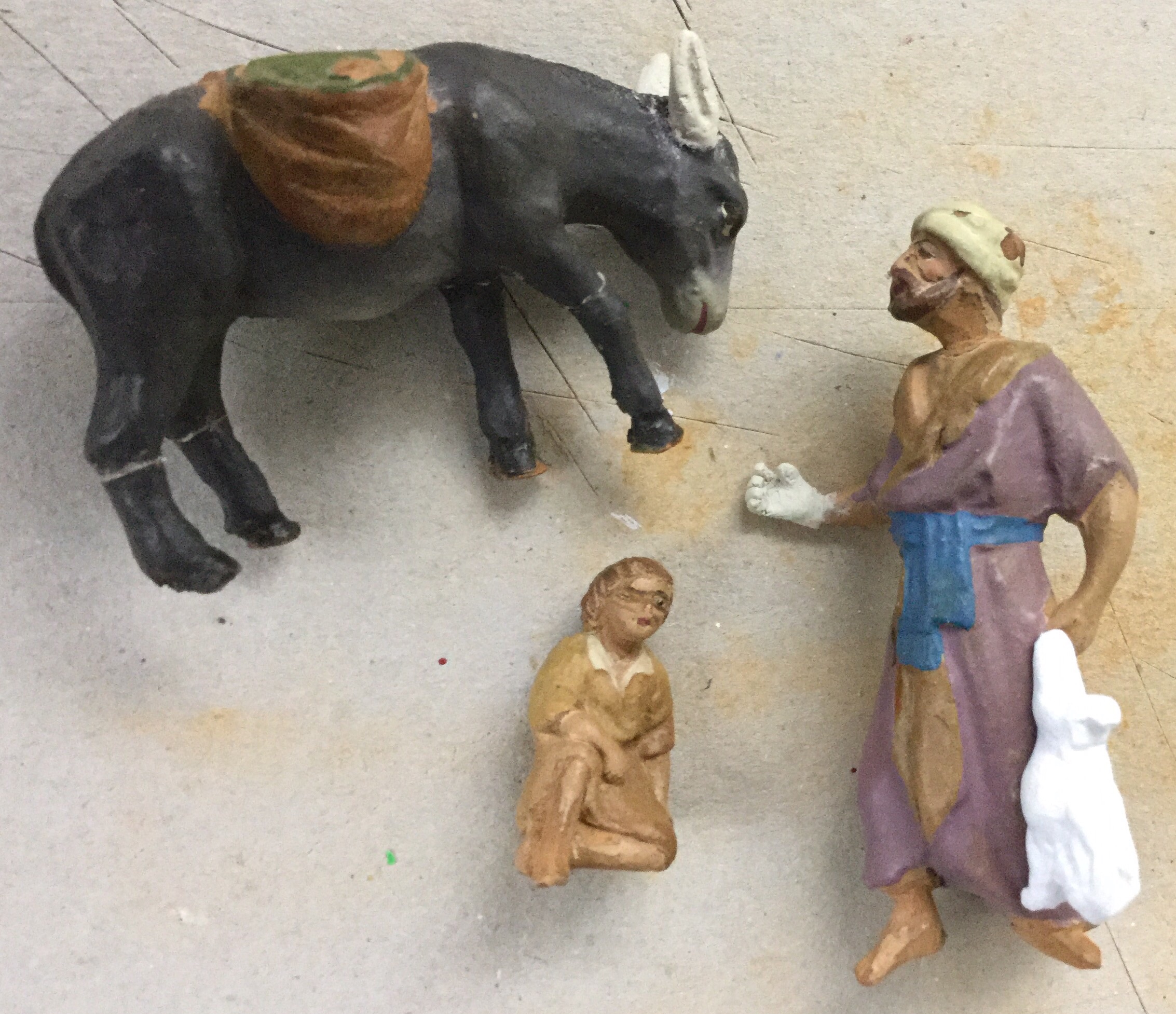 Lo siguiente fue quitar rebabas de las vestimentas y pulir caras y extremidades (pelo de cabezas y barba, manos, brazos y pies). También a la mula, sobre todo quitarle material al cesto que estaba desproporcionado con respecto al original y terminarlo más fino, pegarle las patas y hacerles las orejas. Al pastor la mano y que fuera versátil a las dos variantes con el grupo e individual, las partes nuevas (orejas, mano y conejo) con pasta de arcilla de secado al aire: