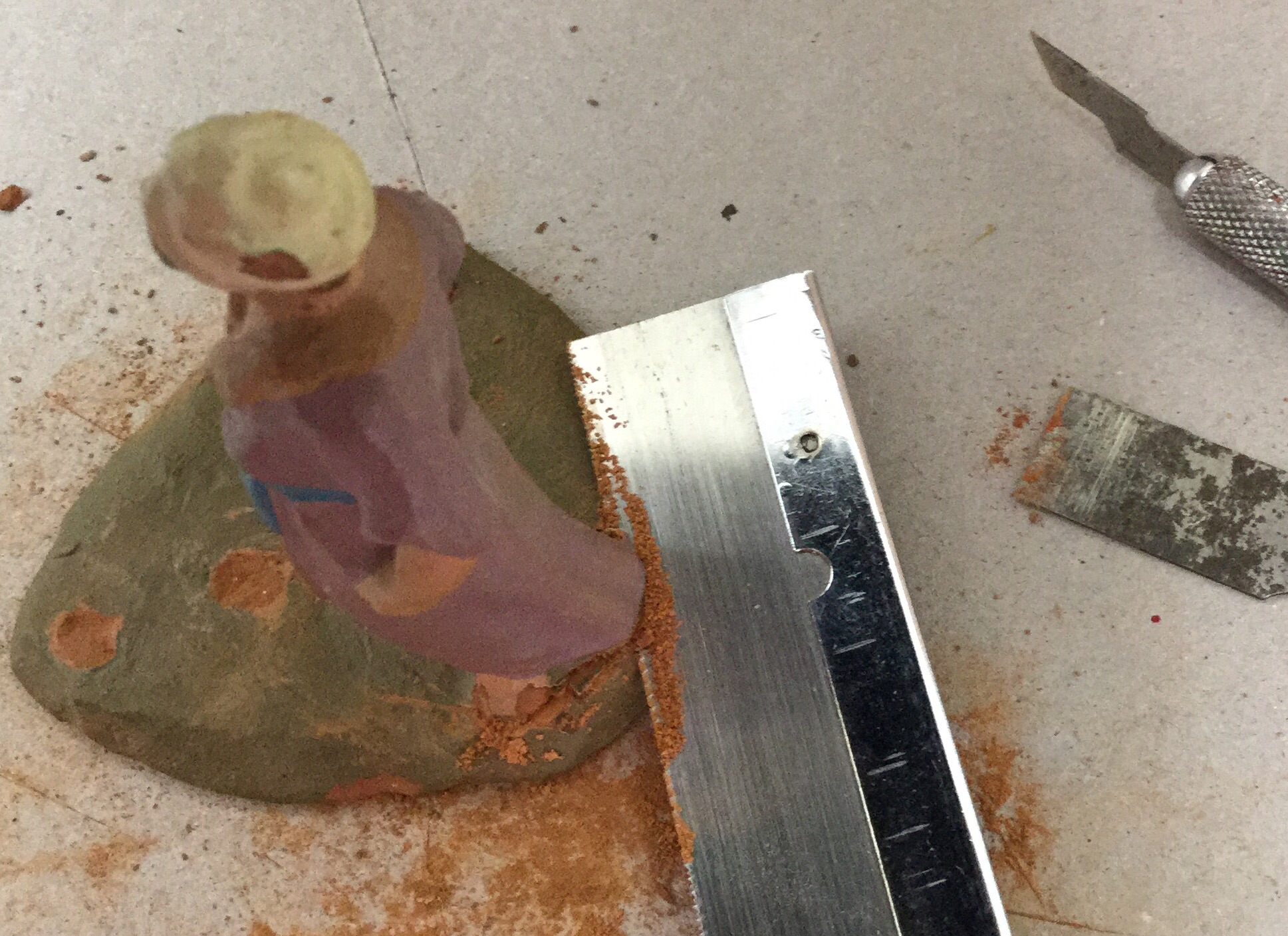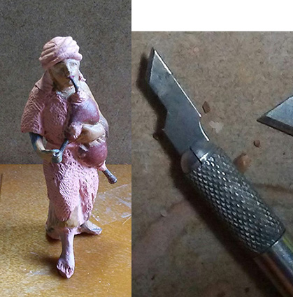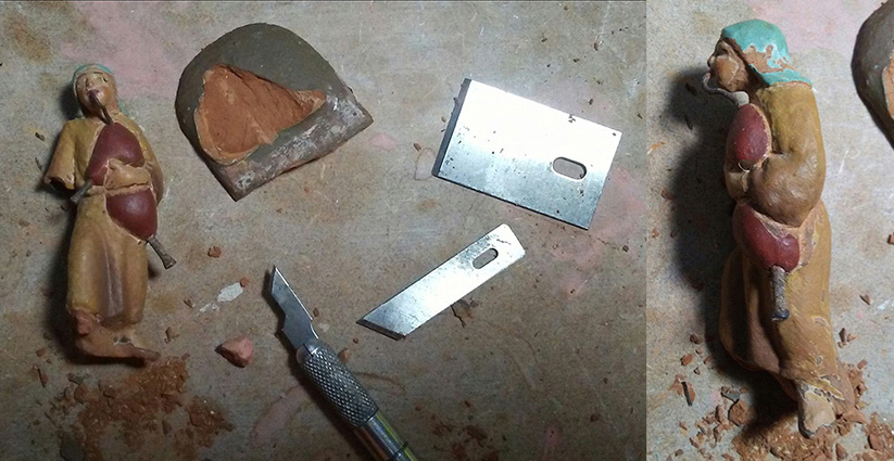 elaboro el pie roto, turbante, parte de la gaita y piel de oveja de la figura original de Castells. La textura de la pelliza la realizo con el fuste de la cuchilla…24 horas de secado,