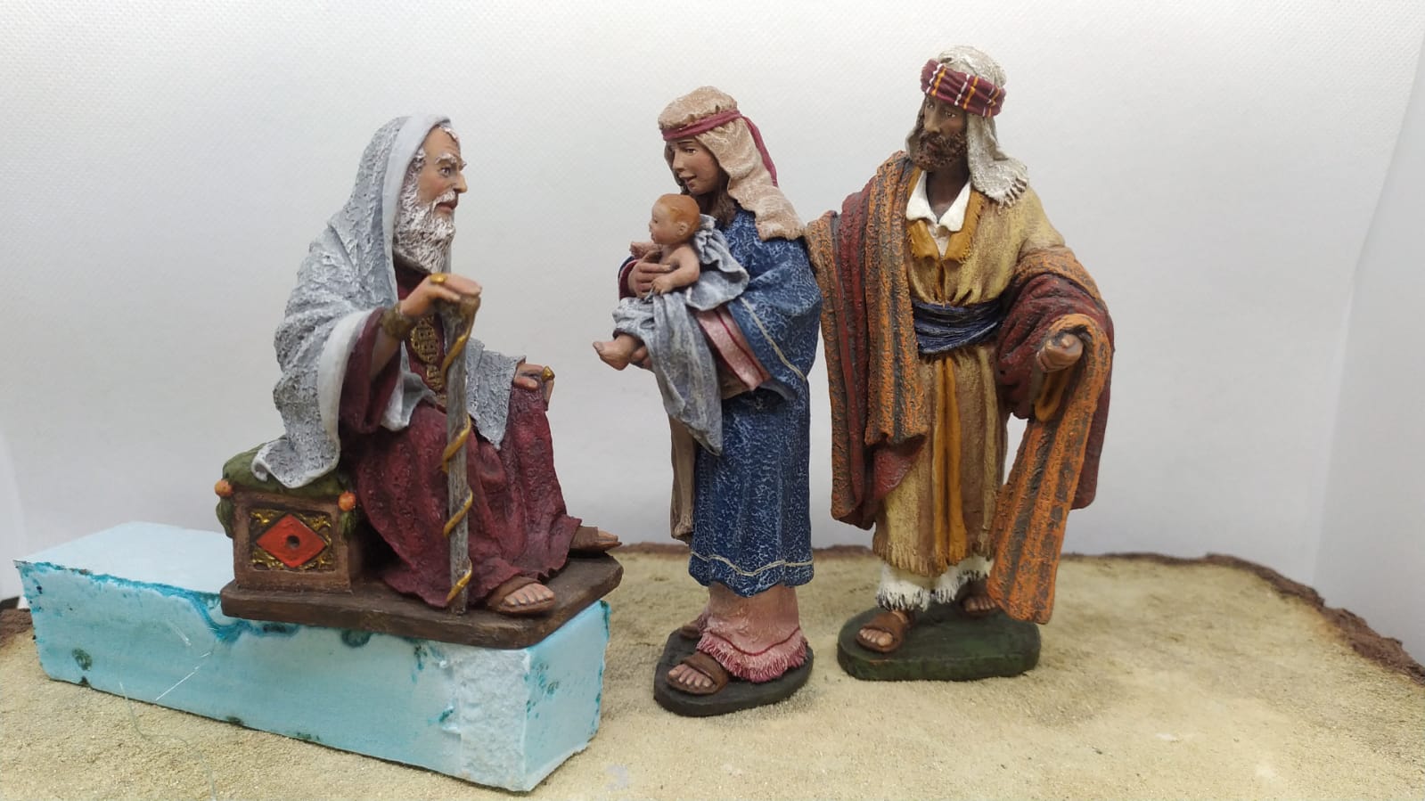 Pasaje "presentación en el templo", 3 figuras de 12cm: sacerdote, San José (también puede usarse como pastor o mercader) y Virgen con niño (también puede usarse como mujer aldeana). Precio: 260 euros.