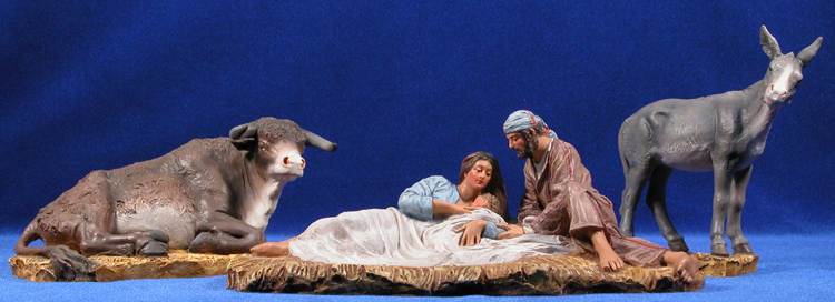 Tengo una figuras pendientes de clasificar, compuesta básicamente por un nacimiento de 8 cm, la virgen coincide perfectamente con la de la foto enviada por Serapaula y José es bien parecido aunque no igual. La duda está en los animales, en mi nacimiento, el cual restauré, al asno le faltaban las orejas, y de origen (años 50-60) estaban realizadas en cartón.