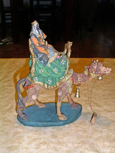 Los Reyes Magos se han pasado por adelantado por mi casa y me han traído... unos Reyes Magos. Es una cabalgata antigua, muy bonita, muy original, más bien "rara". Los camellos son enormes y en cambio los seres humanos son casi diminutos, desproporcionadamente pequeños. Los camellos (que son casi una caricatura de camello) y sus ornamentaciones son muy detallados, también los ropajes de los reyes y sus pajes, pero en cambio las figuras humanas son bastante groseras. He mirado en la web de los pesebristas de Barcelona, en especial dentro de la escuela historicista, de los seguidores de Talarn, y me ha salido Josep Marcé, con unas fotos que se parecen mucho a mis figuras (pero como son fotos muy pequeñas y muy malas, no puedo comparar bien) ¿Quién se atreve a darme alguna opinión?