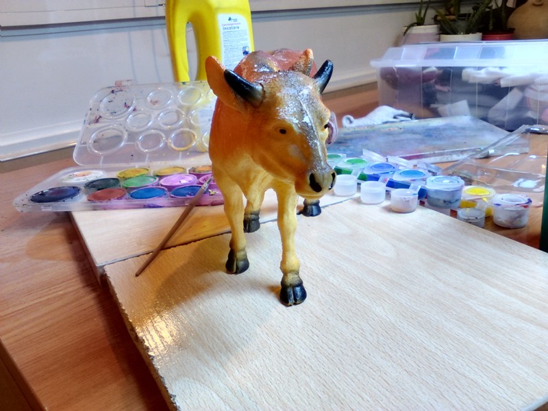 nunca se me hubiera ocurrido usar acuarela con cera , para figuras de plástico, si fueran de yeso tal vez, ahi se hubiera adherido el material, en cambio sobre plastco difícil que cubra bien, tendrias que haber probado con acrilicos , y como te quedo el pastor?