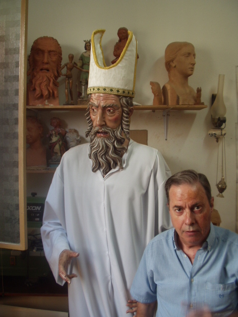 Yo sabía, tras haber visto sus esculturas, hasta ahora dedicadas principalmente a la imaginería (entre sus obras se encuentran varios Cristos, romanos y como véis en la foto, Caifás junto a mí) que era bastante bueno, pero realmente, me ha dejado muy impresionado como ha sabido captar lo que yo quería y plasmarlo en barro, pasando del dramatismo de las tallas propias de Semana Santa, a la dulzura que corresponde a la natividad.
