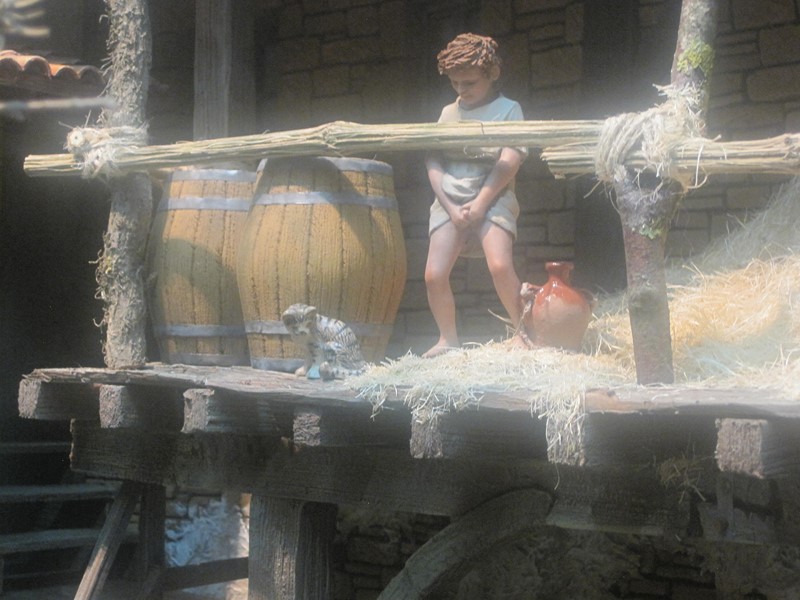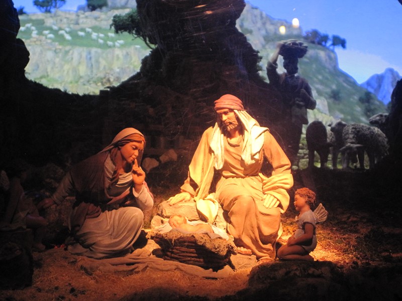 La figura que mencionas estaba más a la derecha sacando dinero de otro cajero, alieno a lo que sucedía a su izquierda. El pesebre muestra las diversas actitudes de las personas ante el Misterio, mientras unos corren a adoarar otro siguen pescando.