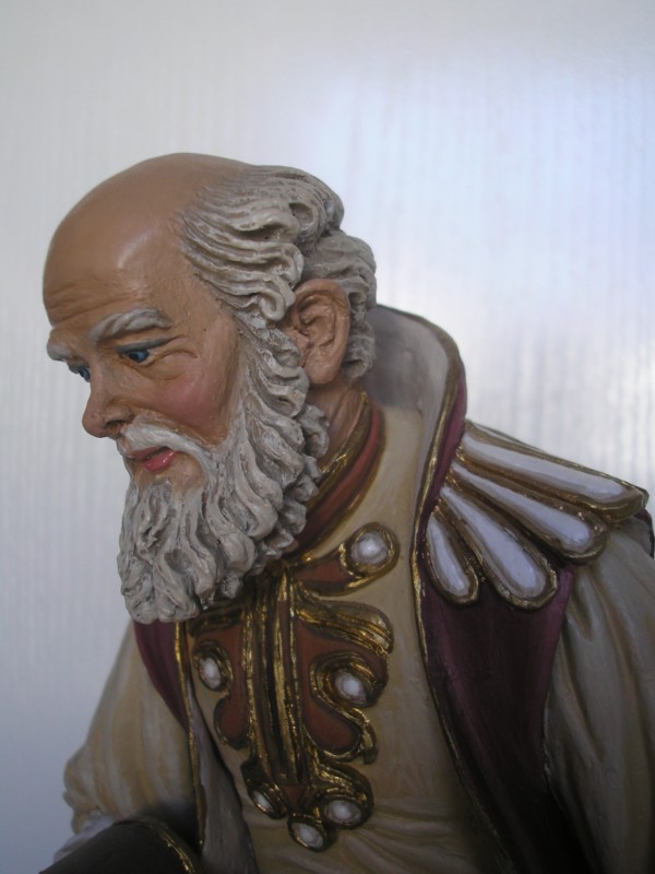 Figuritas(diminutivo) de Belen, creo que el tamaño de 30 por lo menos para mi es excesivo, tambien se que a los artesanos les gusta hacer figuras grandes, es menos complicado segun palabras textuales de alguno de ellos. Ahora bien este rey Melchor esta precioso y la cara que tiene parece una cabeza italiana por su expresion.