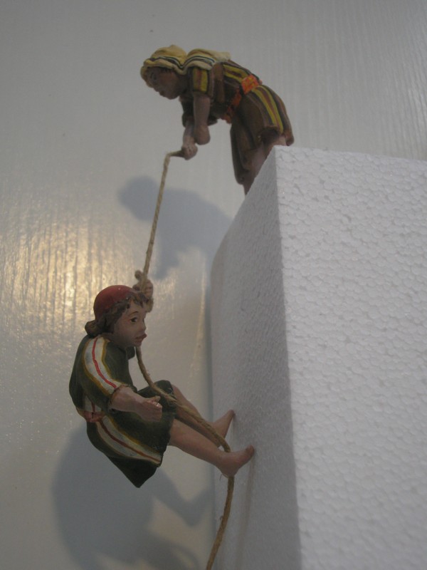 La idea que le llevè fue que me hiciera unos niños cogiendo huevos de un nido.Uno de ellos debía estar suspendido de una cuerda para darle mayor plasticidad al conjunto.