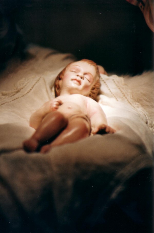 El niño duerme placidamente mientras dos angeles custodian sus sueños.