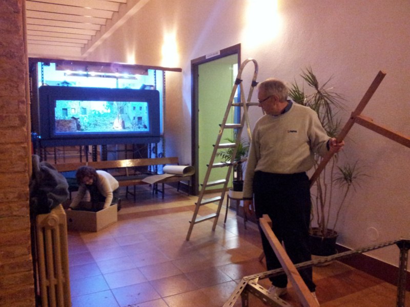 En las fotos, además de algún ejemplo de los belenes expuestos, la visita de los compañeros de Tarragona o el público que algunos días se concentraba en la exposición, no me puedo resistir a incluir también una foto del desmontaje; quizá el trabajo más ingrato, pero que a golpe de villancicos llevaron a cabo mis compañeros. Una tarde de buen ambiente que muestra esa otra parte del trabajo de una asociación, el que nunca sale en las fotos ni memorias de campaña.