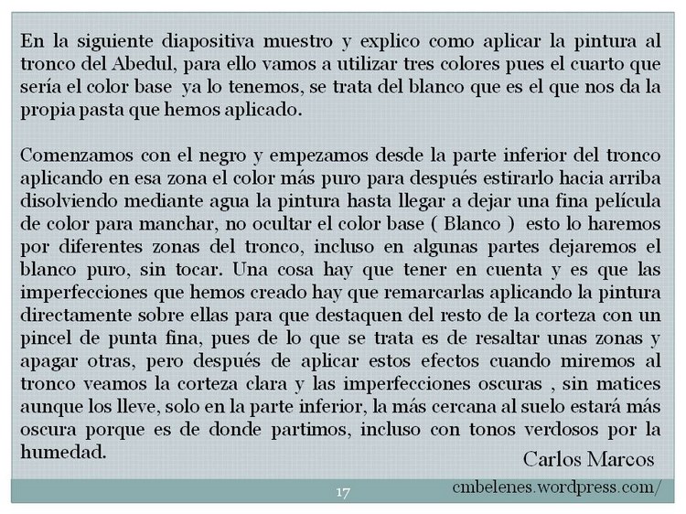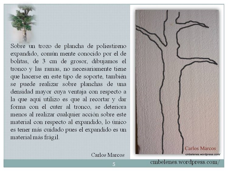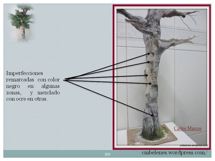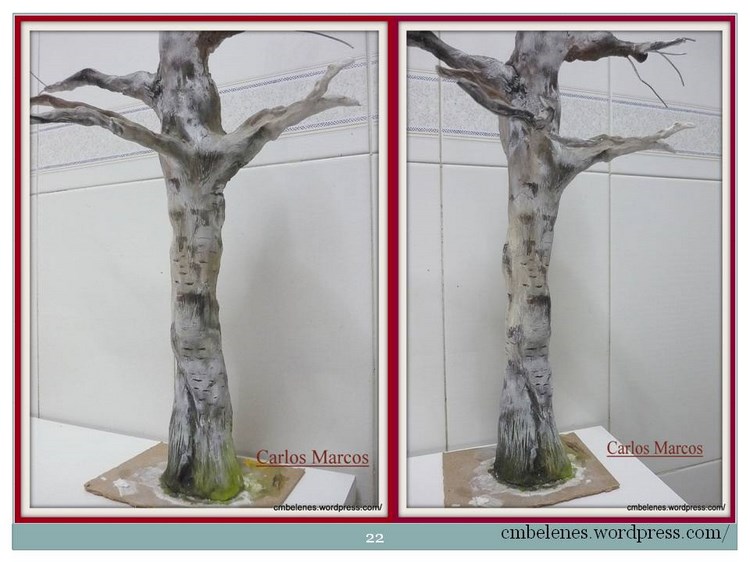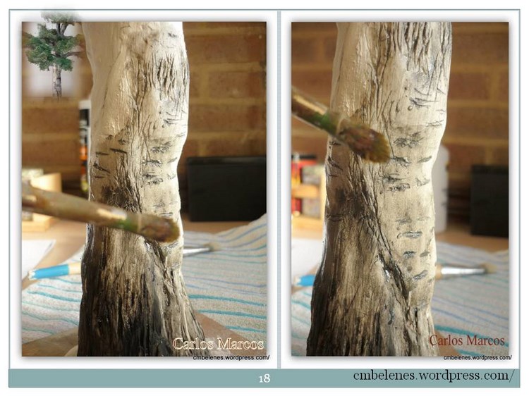 Memen me alegra que te haya resultado fácil realizar este trabajo pues cuando publico algo lo hago con esa intención, me gustaría que pusieses una foto para ver el resultado y poder informarte mejor. Tengo por costumbre como hacen la mayoría de las personas, cuando preparo un paso a paso según lo voy haciendo voy fotografiando los diferentes pasos y el resultado final es el que es y ves, también tengo que decirte que dependiendo donde se realice el trabajo se verá diferente, no es lo mismo hacerlo en un lugar con poca luz que hacerlo al natural, en mi caso concreto está hecho con luz natural y fotografiado con luz blanca concretamente con el florescente de la cocina, es fácil comprobarlo pues el fondo son los azulejos blancos de la misma. Tu sabes muy bien que el resultado de la pintura en un cuadro difiere de donde se realice, de todas formas al follaje hecho con lana de acero solo le apliqué de fondo el color verde en spray que muestro en el trabajo y después le aplico el verdín artificial y el orégano mezclado, este último ya con un color un poco pardo por el efecto del secado al tratarse de una planta natural todo esto lo digo en el paso a paso a la hora de mezclar estos productos, precisamente para que se vea más real con esos claroscuros. Y el resultado del tronco es el que explico, no he hecho nada diferente lo único 2 fotos las tuve que hacer en la terraza el resto en la cocina como lo anterior. Un paso a paso es bajo mi entender una guía cuyo resultado es el que ponemos cada uno de nosotros. Espero que hayas disfrutado del espíritu belenista al que aludes al principio de este comentario si no es así me vuelves a preguntar las veces que necesites que para eso estamos. Un cordial saludo